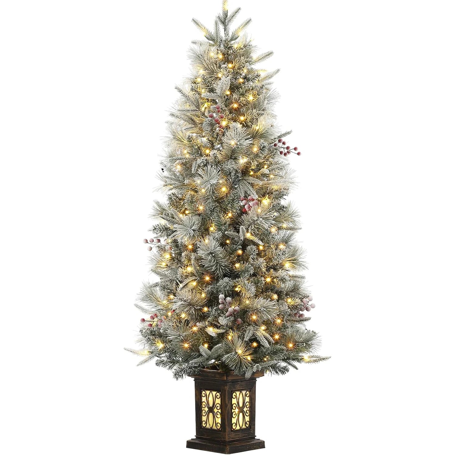 4.5ft Pre-Lit Flocked Artificial Christmas Tree Xmas Tree With 386 Branch Tips & 200 Lights For Home Party Decor Room Ornaments