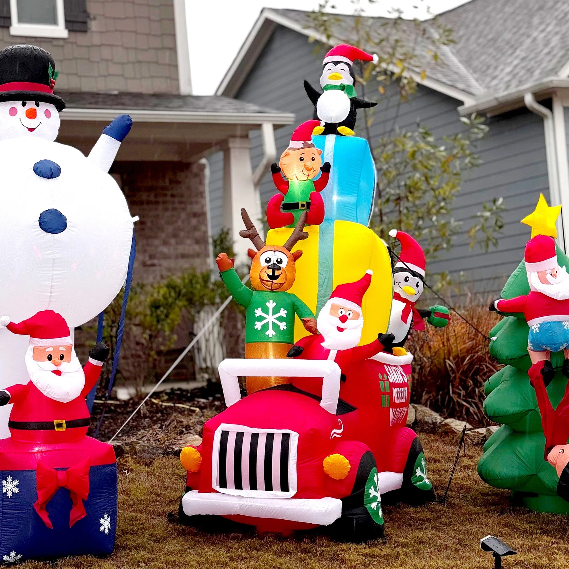 - Inflatable design features Santa Claus driving a gift car, creating a playful centerpiece that brightens your outdoor Christmas decor during both daytime display and nocturnal viewing.